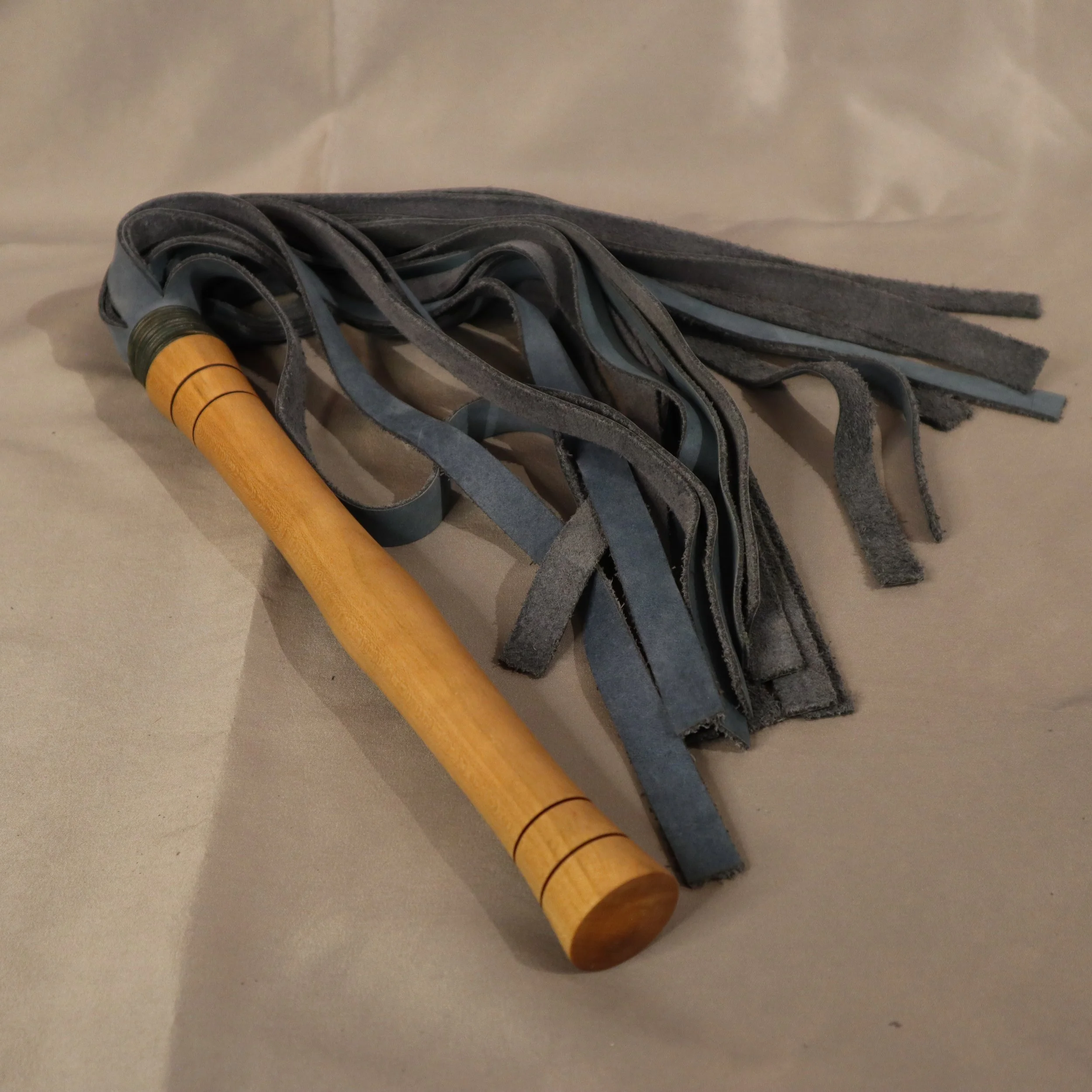 Blaues, weiches Rindseder mit einem Griff aus Ulmenholz und einer grünen Lederriemenbindung.