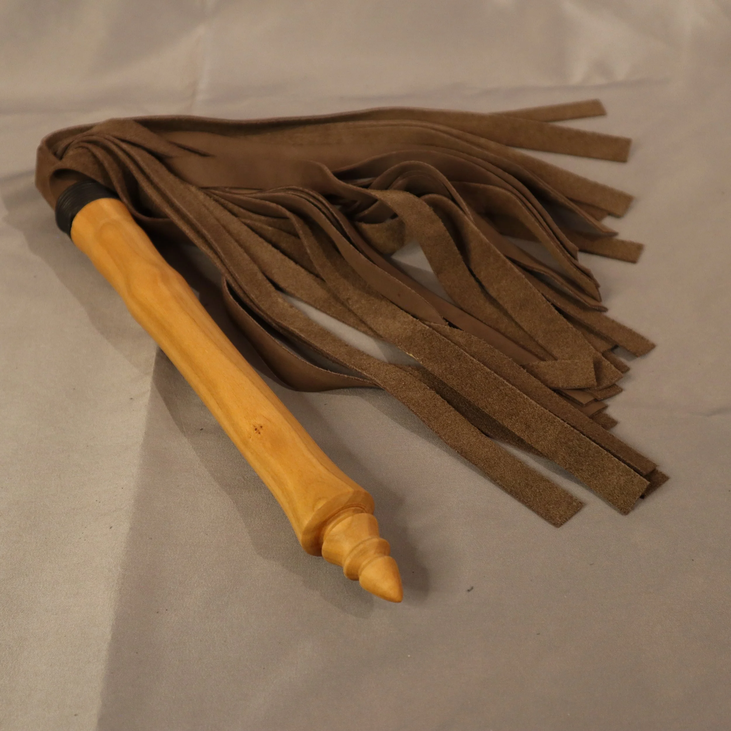 Braunes,weiches Nubukleder mit einem Kirschholzgriff und einer schwarzen Lederriemenbindung.