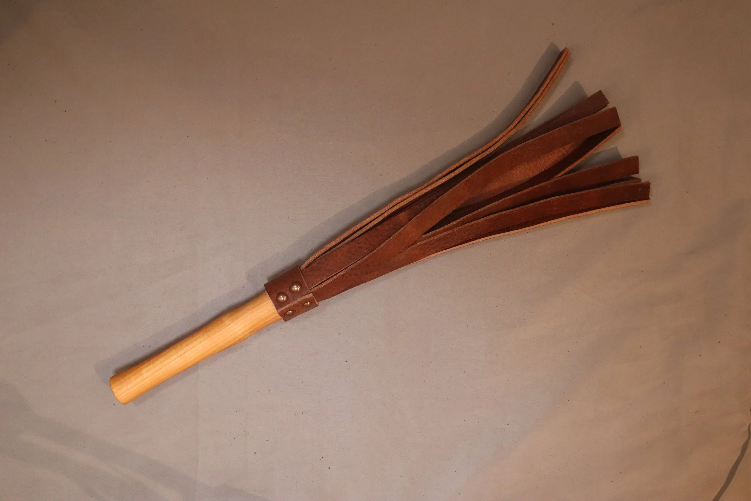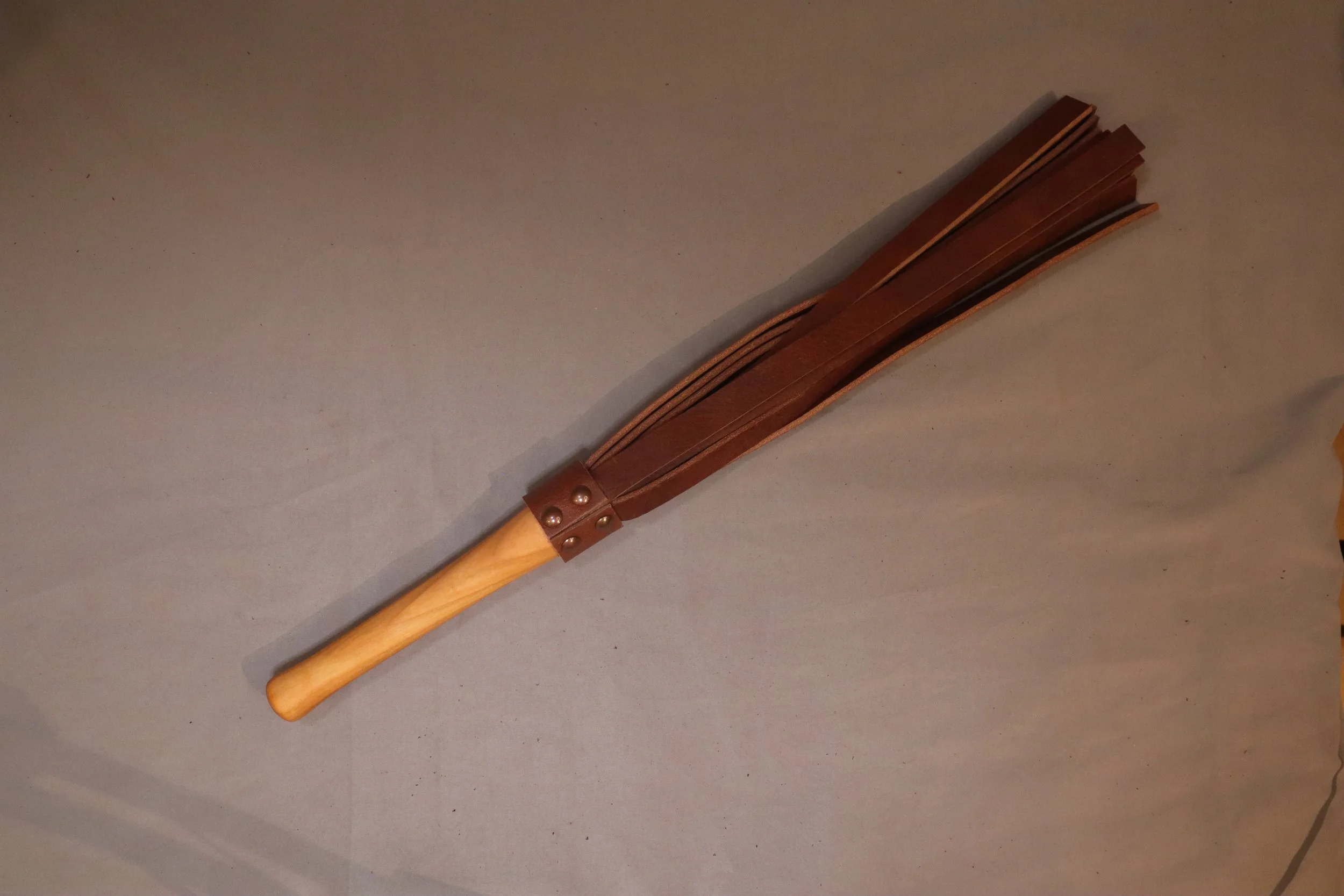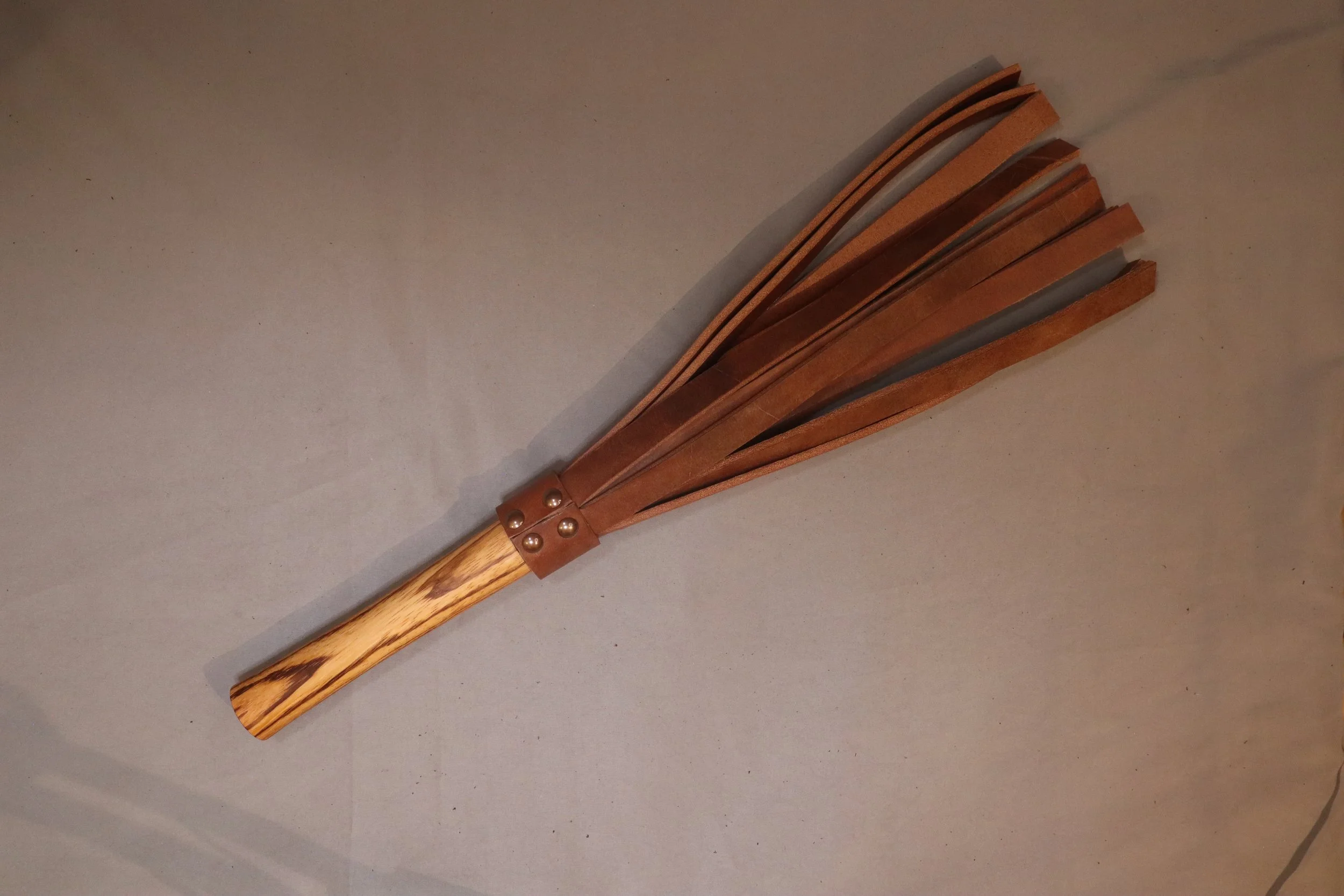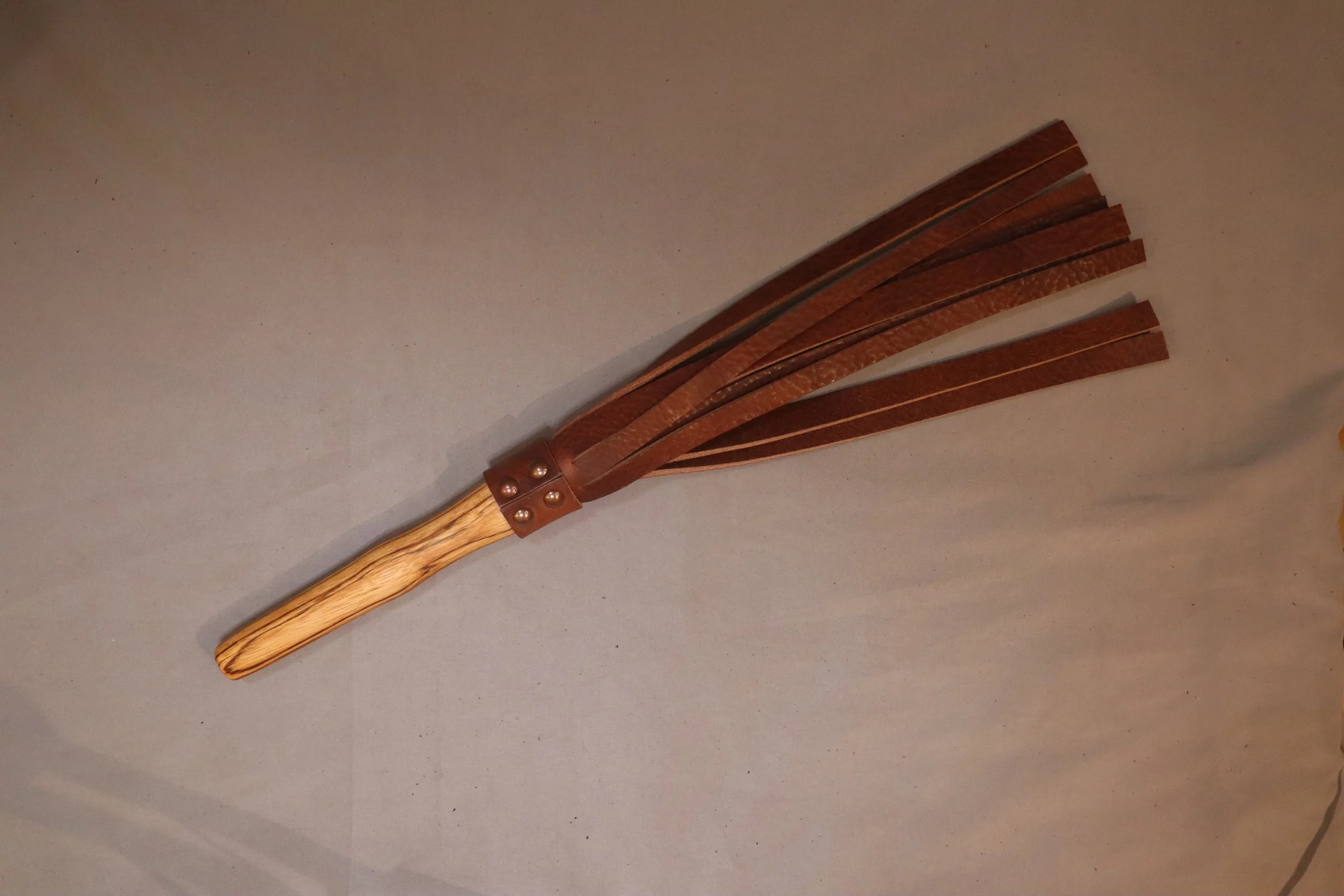 ein Flogger mit kurzem Vollholzgriff aus Padouk, Kirsche, Zebrano oder Amerikanischem Nussbaum.