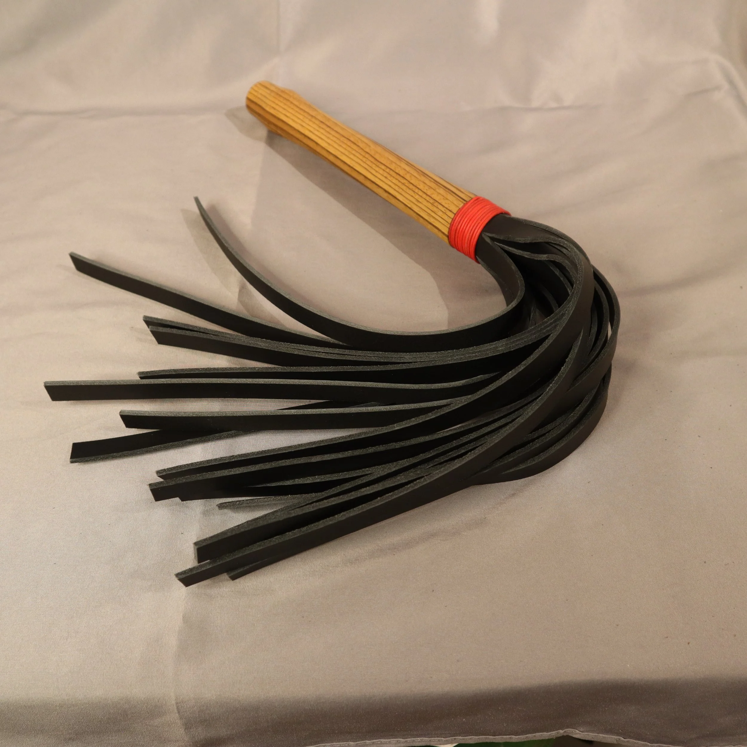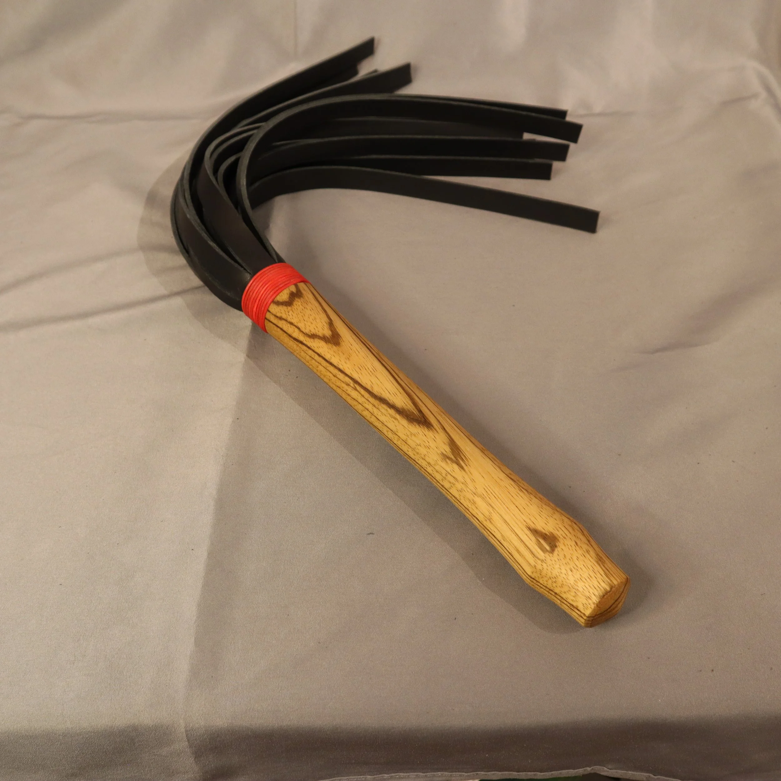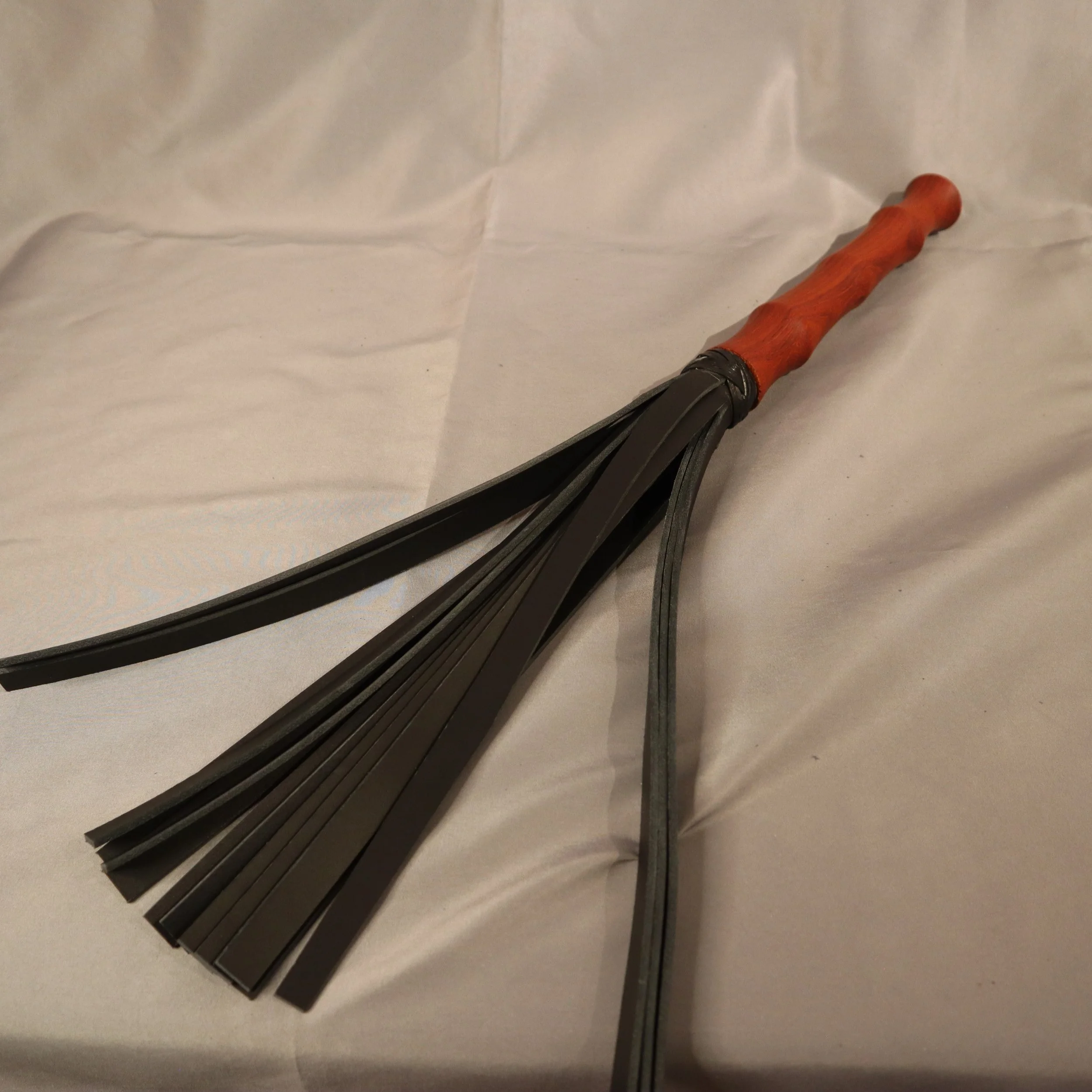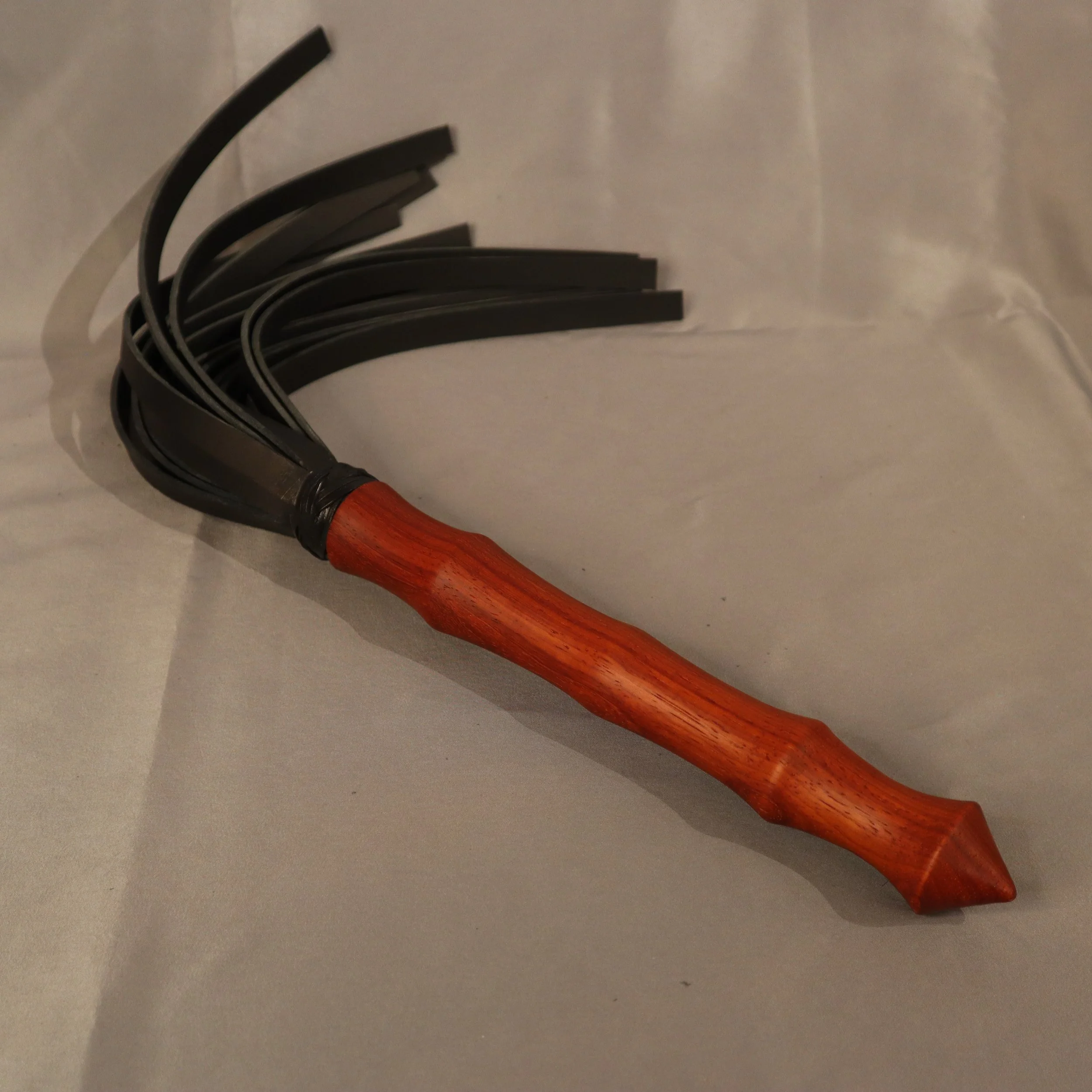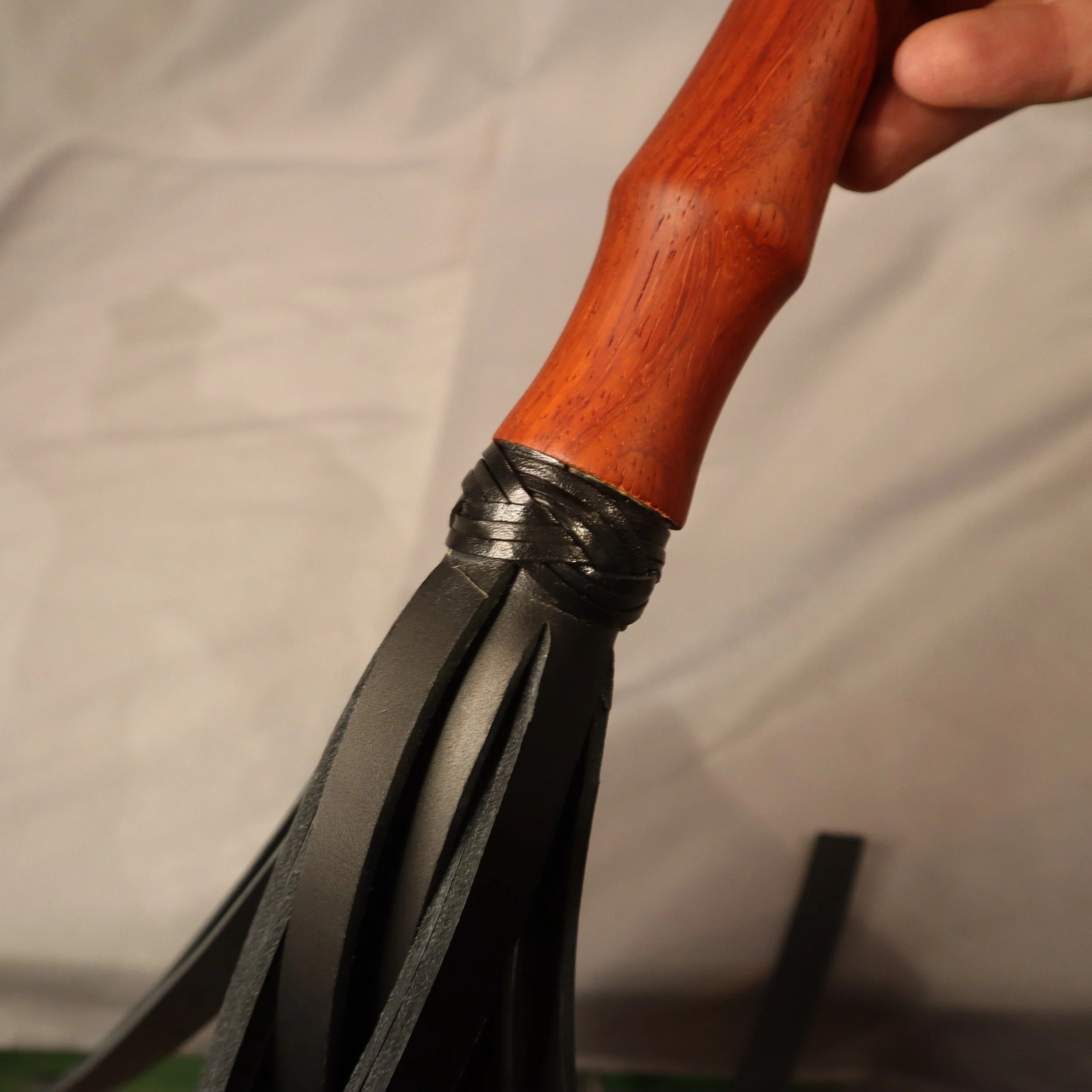 Ein Flogger mit langem Vollholzgriff aus Padouk oder Zebrano.